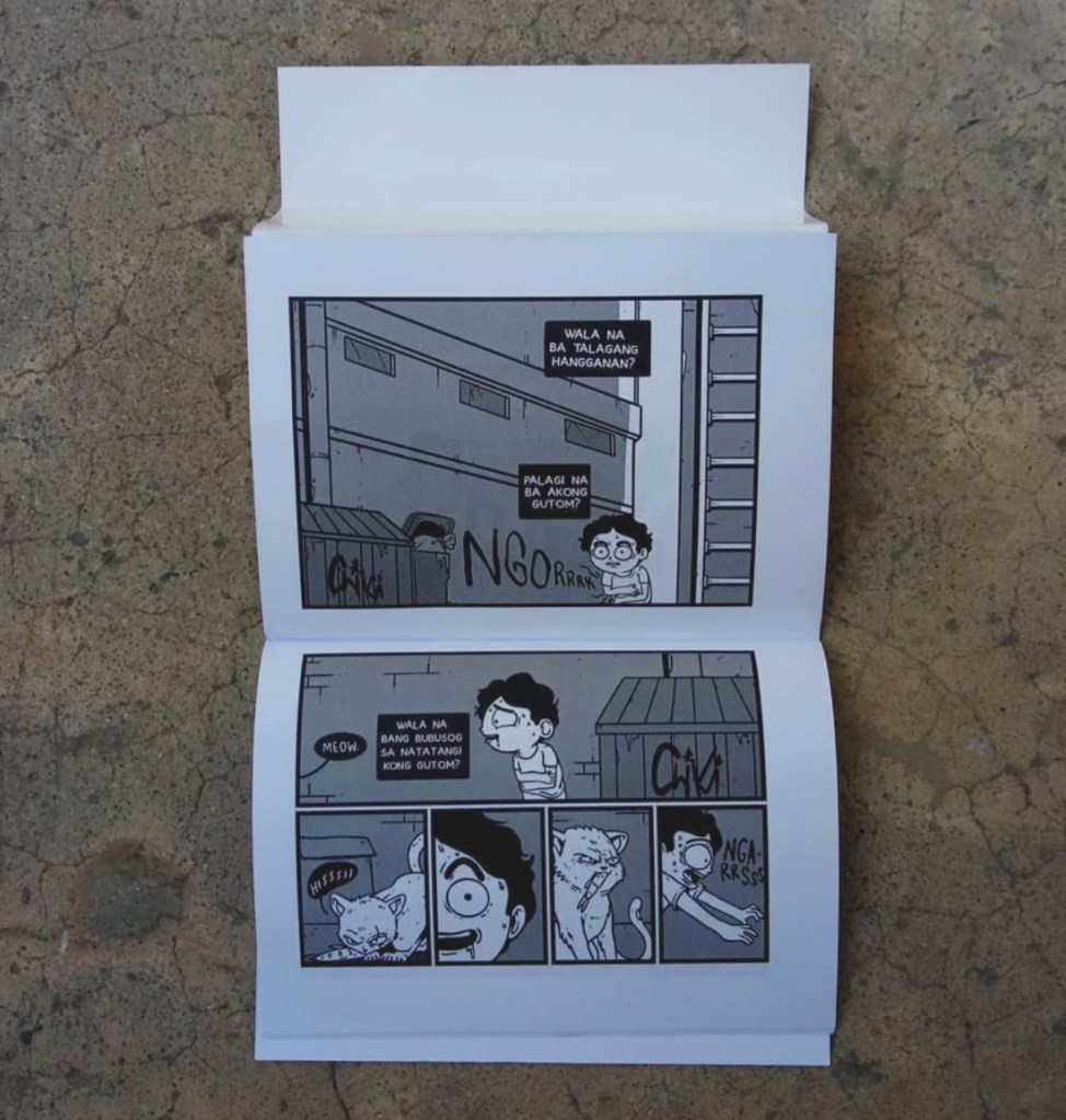 “Ardie Aquino is not done with this wave of testing the limits of comic presentation, this time with three horror short pieces. All three are effectively creepy, most particularly because his control of contrast and elements is getting incredibly good, without losing what makes his style unique. Therefore the suspense leading to the punchlines are effective, making it all nicely creepy and scary. The lengthwise presentation makes him able to deliver a bit more panels thus more story per page. Definitely not for kids, but yes, go find and go order.”