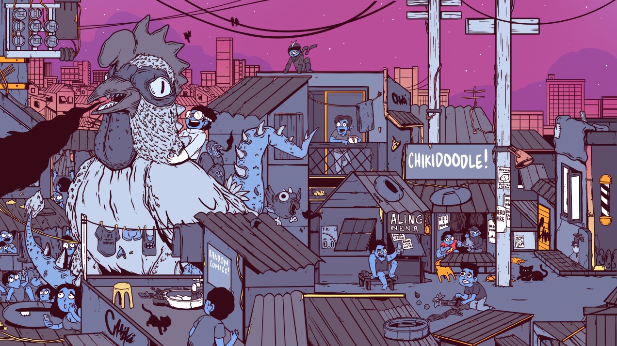 “Cockatrice Night Slum” A cockatrice is a mythical beast, essentially a two-legged dragon or serpent-like creature with a rooster’s head.
